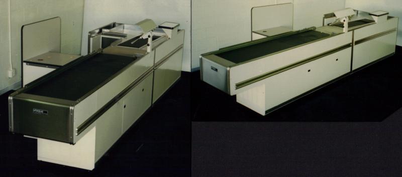 Shown: Standard 60" single belt checkout counter system with termonal stand and optional stainless steel bridge. Also available in 72" and 96" front sizes.